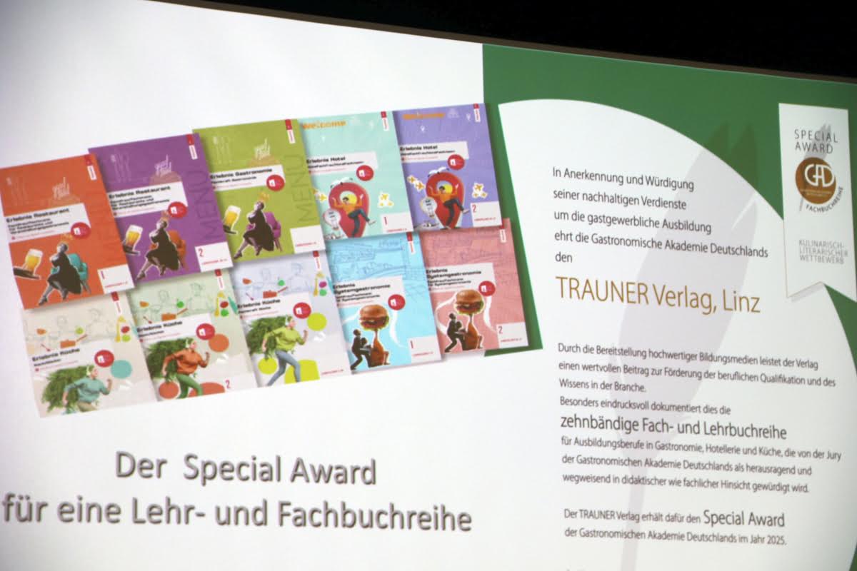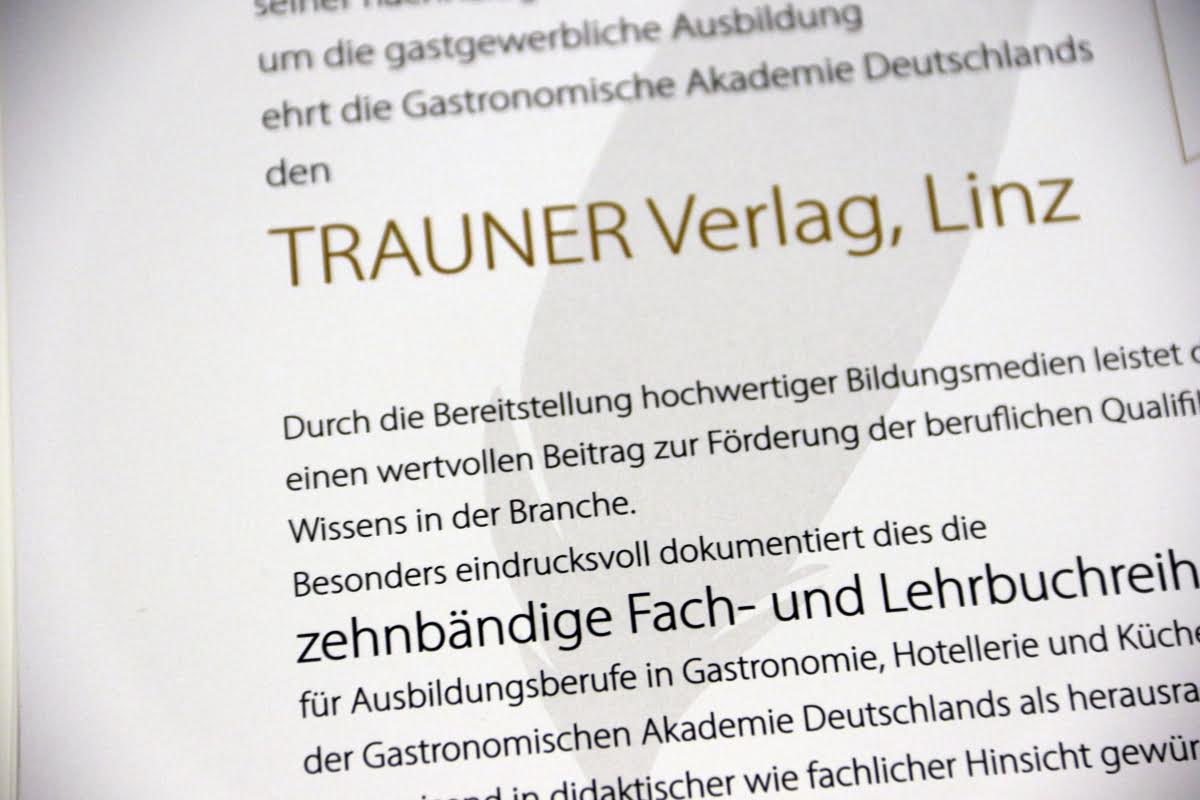 Die GAD-Jury vergab in diesem Jahr während der Preisverleihung im MELIÁ Hotel - Frankfurt-City insgesamt 12 Goldmedaillen für die besten Bücher in den jeweiligen Kategorien, darunter auch neu das Thema „Kochen und Ernährung für Kinder“, sowie 54 Silbermedaillen für besonders empfehlenswerte Bücher, darüber hinaus vergab die Jury einen Sonderpreis und einen Special Award. Dieser ging an den Trauner Verlag, Linz, für seine Verdienste um die gastgewerbliche Ausbildung in Deutschland. Durch die Bereitstellung hochwertiger Bildungsmedien leistet der Verlag seit vielen Jahren einen wertvollen Beitrag zur Förderung der beruflichen Qualifikation und des Wissens in der Branche. Besonders eindrucksvoll dokumentiert dies die zehnbändige Fach- und Lehrbuchreihe für Ausbildungsberufe in Gastronomie, Hotellerie und Küche, die von der Jury der Gastronomischen Akademie Deutschlands als wegweisend in didaktischer wie fachlicher Hinsicht gewürdigt wird.